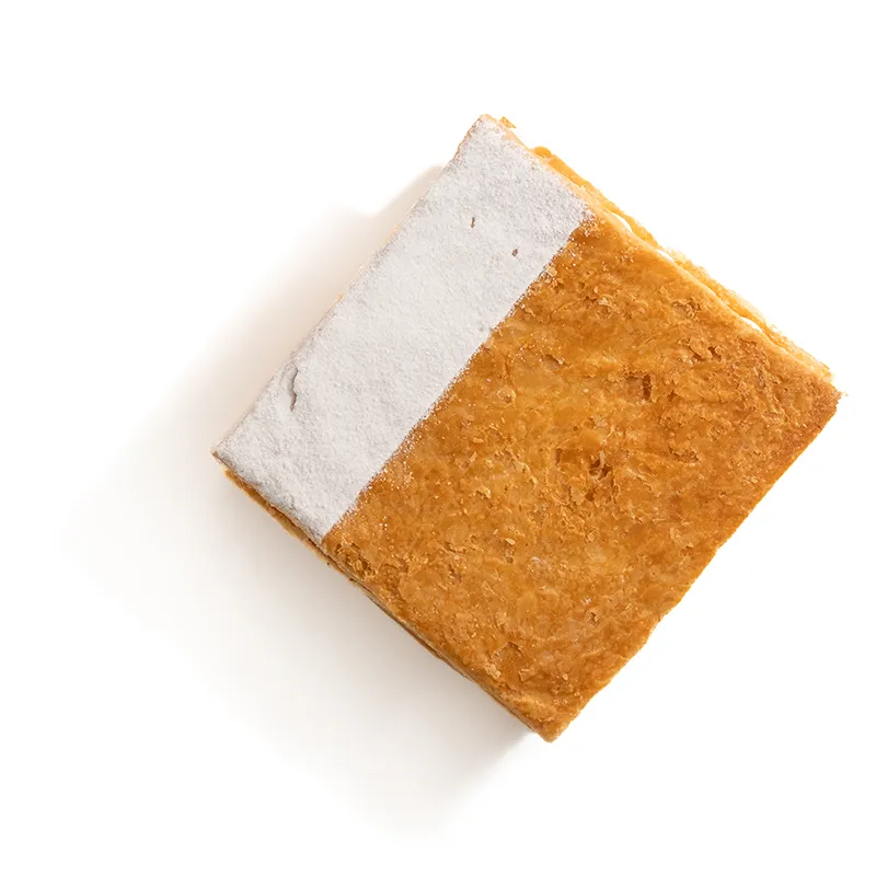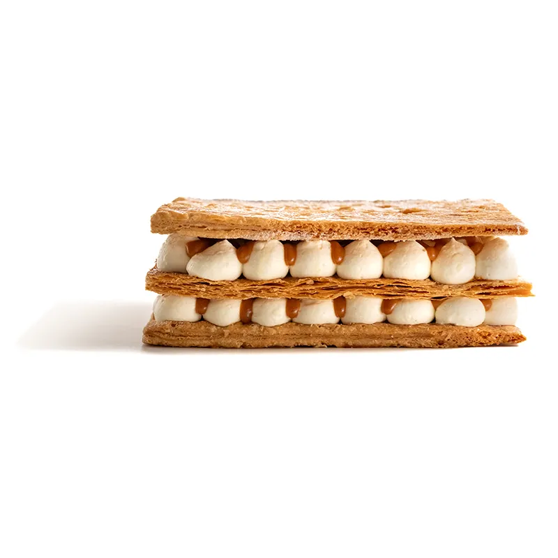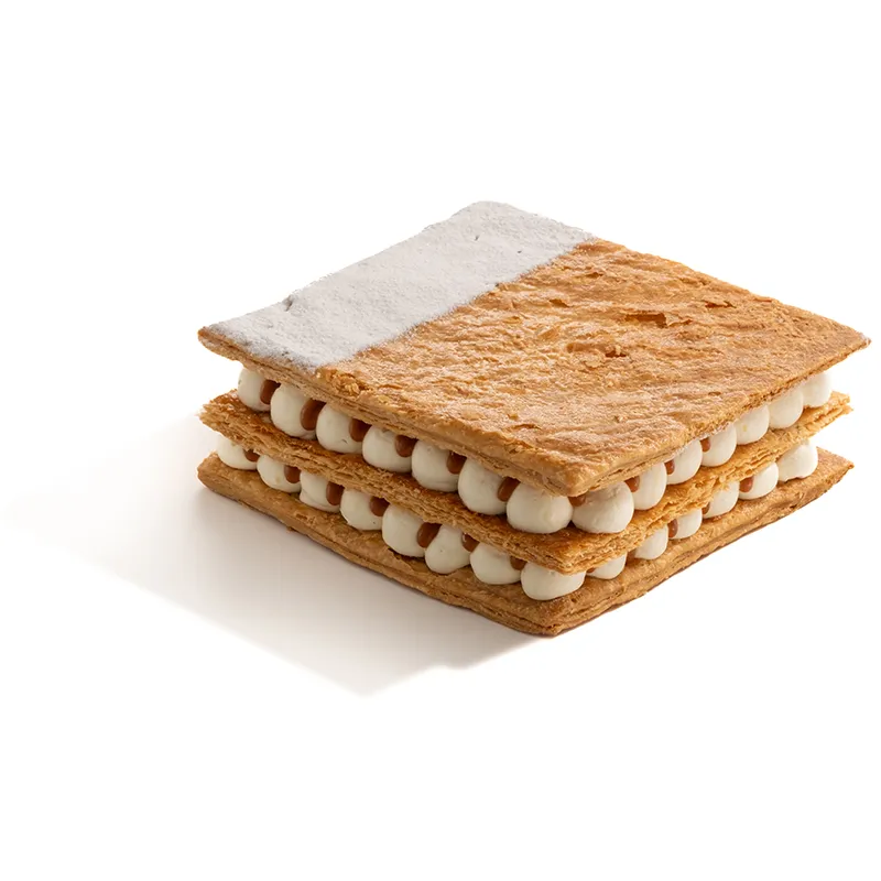 مناسب برای 5 تا 6 نفر. سه لایه خمیر فویته ی تهیه شده با کره که بین آن با کرم پتیسیر میلفوی و گنش کارامل پر شده و با پودر قند تزئین میشود.